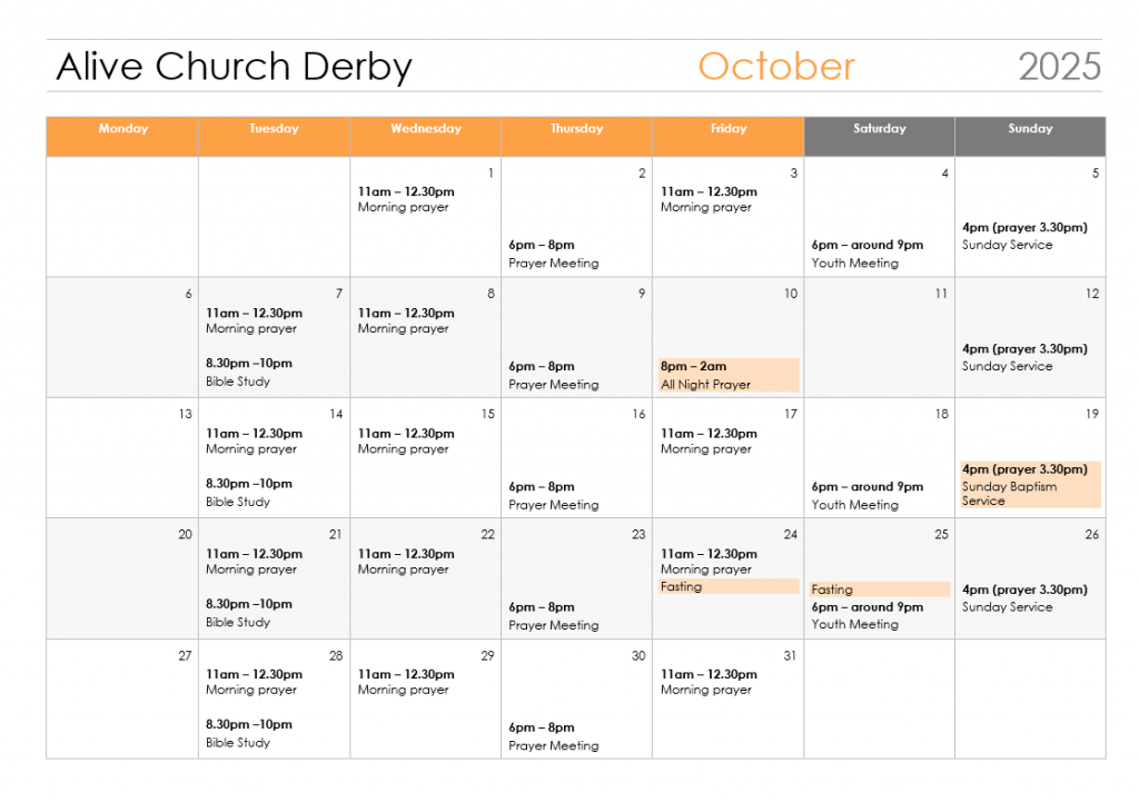 Prayer Meeting: Thursday 6pm – 8pm Sunday Service: 4pm